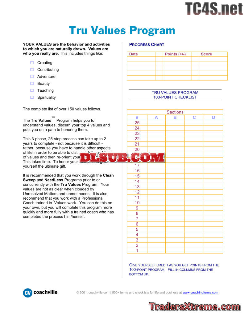 Tru Values Program Checklist Of More Than 150 Values - JPG Image File
