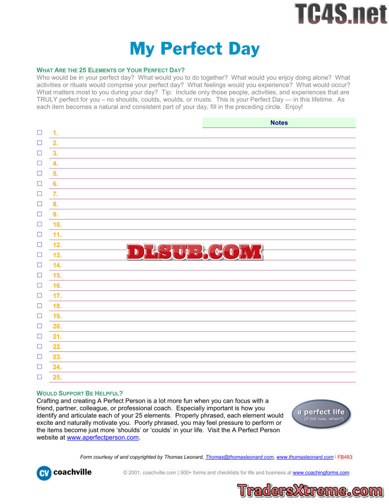 Worksheet To Determine 25 Elements Of A Perfect Day - JPG Image File